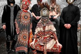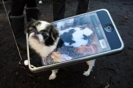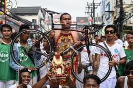 Men carry a dog, wearing a costume and seated on a stool, as a form of respect as they believe that dogs found water for their ancestors, during a local festival for the Miao ethnic minority in Jianhe county, Guizhou Province, China