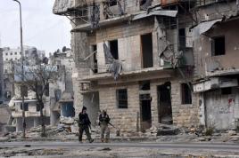 Free Syrian army fighters stand atop of a hill as the moon is seen in the background in the south of Nawa city, in Deraa Governorate, Syria
