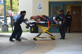 Rescue workers carry a survivor on a stretcher, after he was extracted from a collapsed wall in an informal settler house, just beside the city jail building in Manila