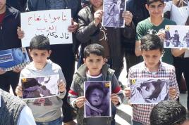 A woman attempts to cover a tear gas canister fired by police at a crowd in Srinagar protesting against the recent killings in Kashmir