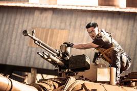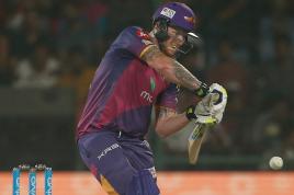 An Indian policeman uses a slingshot during clashes with demonstrators following a protest in Srinagar against the recent killings in Kashmir