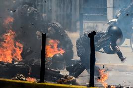 An injured riot policeman is helped by comrades during clashes with independent miners against Bolivia's President Evo Morales' government policies, in Mantecani near La Paz, Bolivia