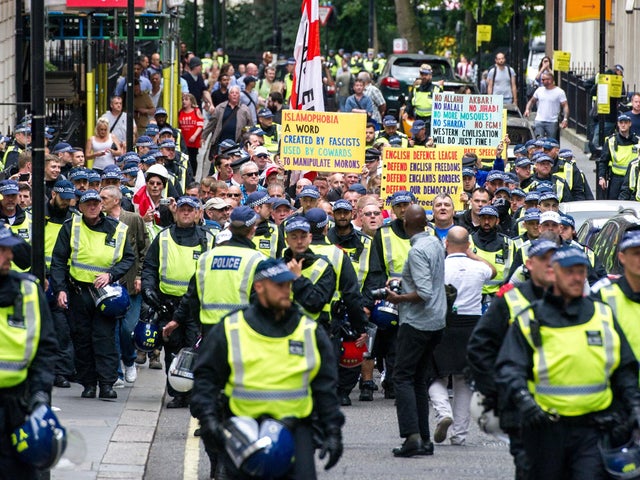 Members of the far-right anti-immigration English Defence League (EDL) march from Victoria Embankment to Charing Cross Station under heavy police guard, in Londnon, as anti-Fascist groups held a counter-demonstration nearby(EPA/PETE MACLAINE)