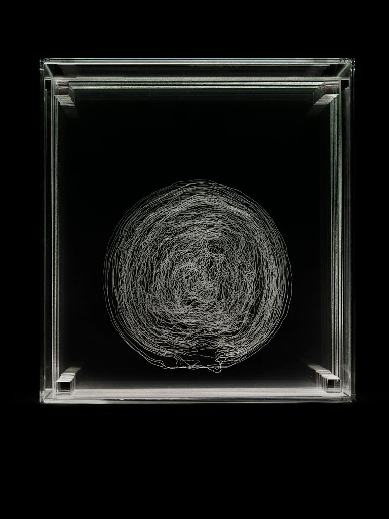 The artist Angela Palmer describes her work as “mapping”. She charts the geography of the human body using thin layers of glass, on which she paints detailed biological topography. Her source material is scans from MRI and CT machines normally used to detect disease in the body. The resultant effect is precise but not medical. Her work has been compared to an Ordinance Survey map of the human body. The overlaid marks are gestural and sketchy and could delineate a mountain range or undulating dessert.