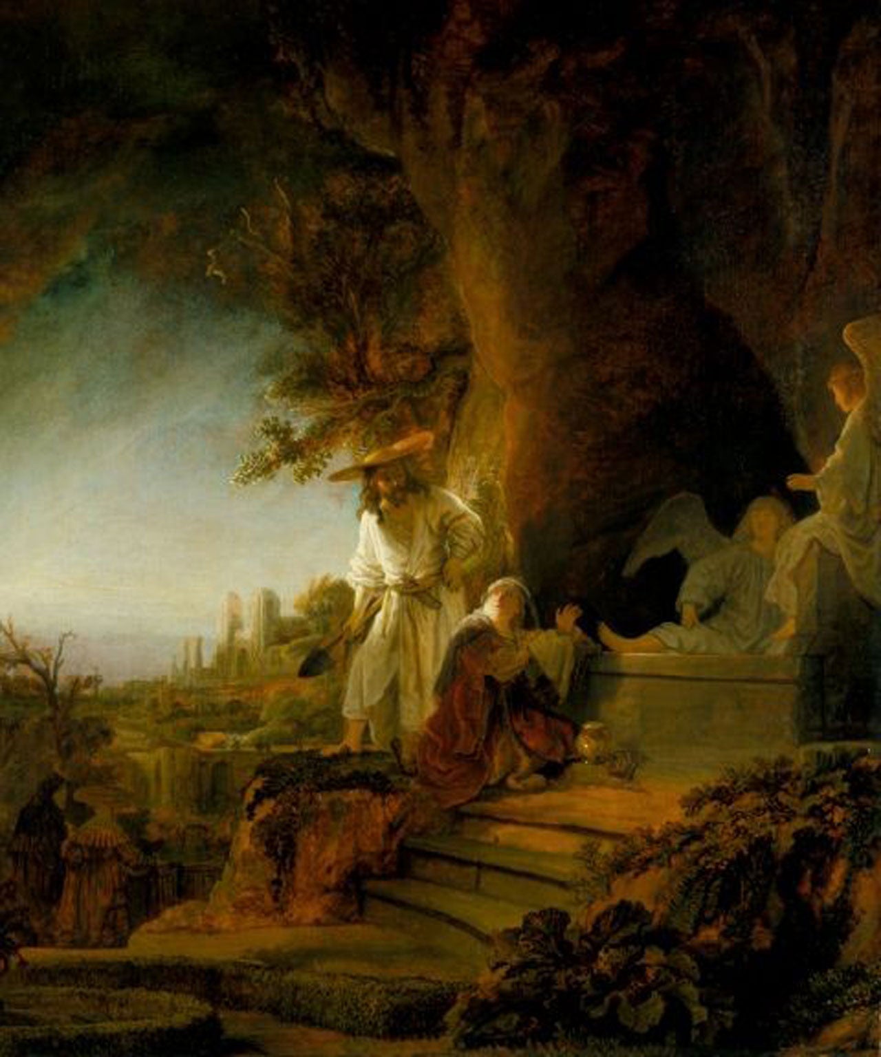 The two paintings form a fascinating study in contrasts between these giants of Low Countries art. Rubens is all brash and bravura, the Virgin ascending amid a riot of naked babies and great swirls of robes and outflung gestures. Rembrandt has none of the energy of Rubens or the panache. Instead, his exquisite small work represents the moment when Mary Magdalene looks up from her keening at the empty grave to see and then recognise the risen Lord as he calls to her by name. The light of the sunrise catches Christ in wide hat and white cloth, carrying a spade as the gardener she first takes him for, and illuminates one side of Mary Magdalene’s face as it dawns on her just who this is. It’s a study of great precision in the depiction of the vegetation to the right and left of the steps, the towers of the Temple of Jerusalem in the background and the odd touch of one of the angels casually relaxed on the tomb.