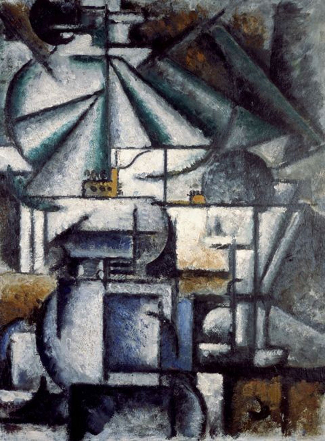 Ardengo Soffici’s Deconstruction of the Planes of a Lamp, for example, “analyses” or disassembles the way in which a lamp sheds its light by breaking up our visual understanding of lamp and light into blockish facets or patches of colour. Picasso’s collage, Bottle of Vieux Marc, Glass, Guitar and Newspaper seems to belong in the hectically transient world from which it has scavenged its constituent parts: fragments of wood and newspaper. It seems to swarm about the moment of its making. The way in which the still life, the portrait bust or the full-length figure is being fabricated feels distinctively different here, more agitated, more aggressively expressive of its own materials .
