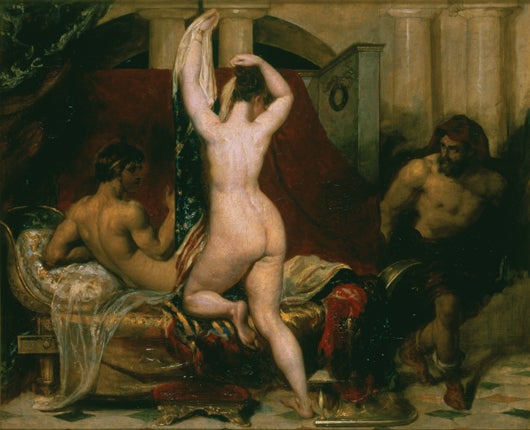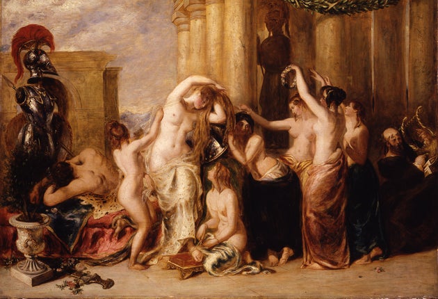 The moral part no longer worries us, of course. The idea that art ought to have an improving purpose, as the Victorians believed, has long since vanished in the squibs of Oscar Wilde and the revolution wrought by Manet. But the glorification of nubile flesh does still take you aback, as anyone visiting this show must notice. Not the presence of the nudes, it should be said. The naked body has been a major theme of art ever since the Renaissance and Etty, well versed in the work of the masters, set out to emulate them, above all the Venetian painters. It's the way Etty positions the nudes so they dominate the picture that disconcerts. That and the way he has them looking away from you. The models don't meet your gaze, or glance away from it, as they would in Renaissance or modern art. They look elsewhere, as if unaware of your presence, transforming you into a faintly shameful voyeur. It's the subject of one his most decried works, Candaules, King of Lydia, Shews his Wife by Stealth to Gyges, One of his Ministers, as She Goes to Bed. The voyeurism is there, too, in the diploma work he painted after gaining entry to the Royal Academy of 1828, Sleeping Nymph and Satyrs, (never shown in his life), in which one of the satyrs pulls the sheet from a wonderfully sensual nude, her cheeks rosy with desire.