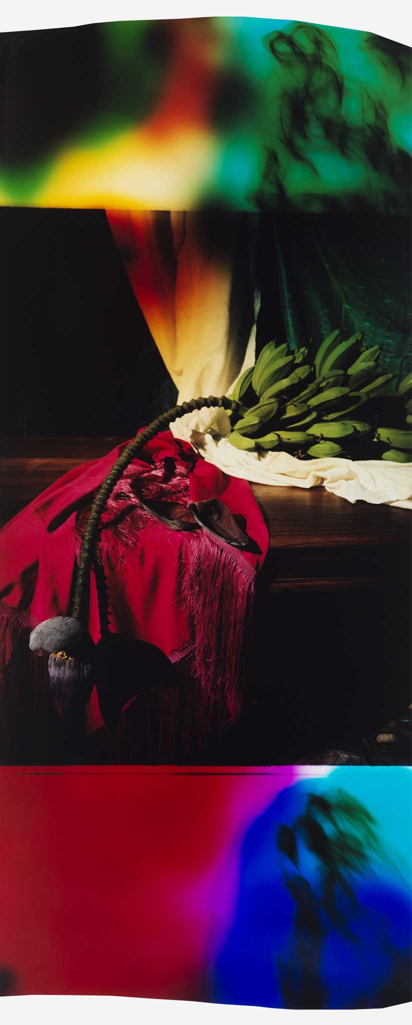 In "Delicious Monster with Juju Hat", for example, we see her favourite plant, Monstera deliciosa, native to the rainforests of Mexico, which now resides in her own garden. The hat, meanwhile, is one worn to traditional ceremonies in Cameroon; made of feathers, it represents notions of prosperity and goodwill – though here, with the Monstera, it also speaks of the exotic come to Botswana, making us question our ideas of the indigenous and our assumptions of Africa.