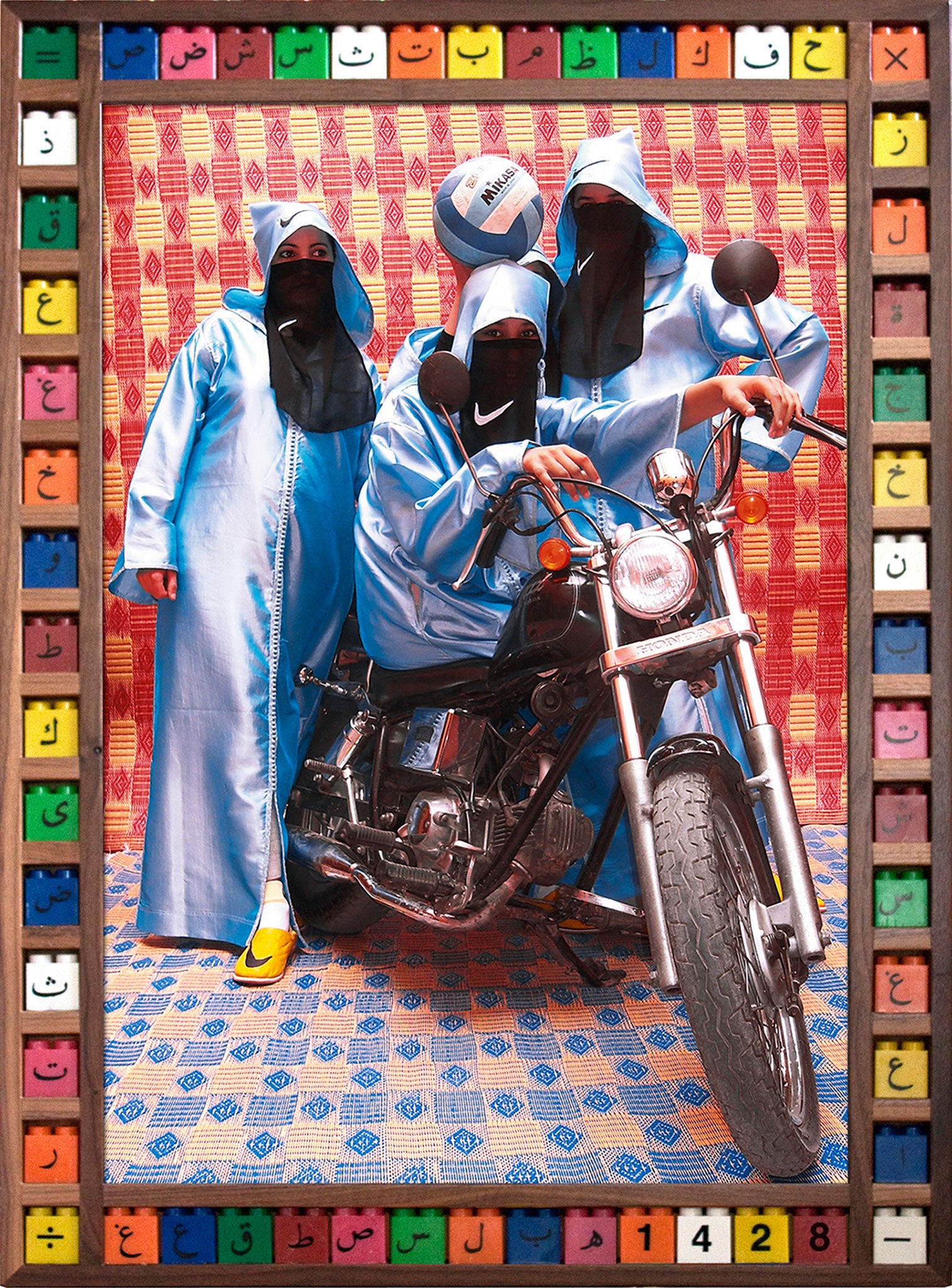 "Kesh Angels", a project he began after moving to the city in the early 1990s, does exactly that. Subverting preconceived notions of Arab women, the series is a tribute to the young, care-free, independent biker girls of Marrakesh, who wear apparently traditional garb that is as defiantly modern (from the Pop Art brights to Nike logos) as the borders that Hajjaj has created for the work.
