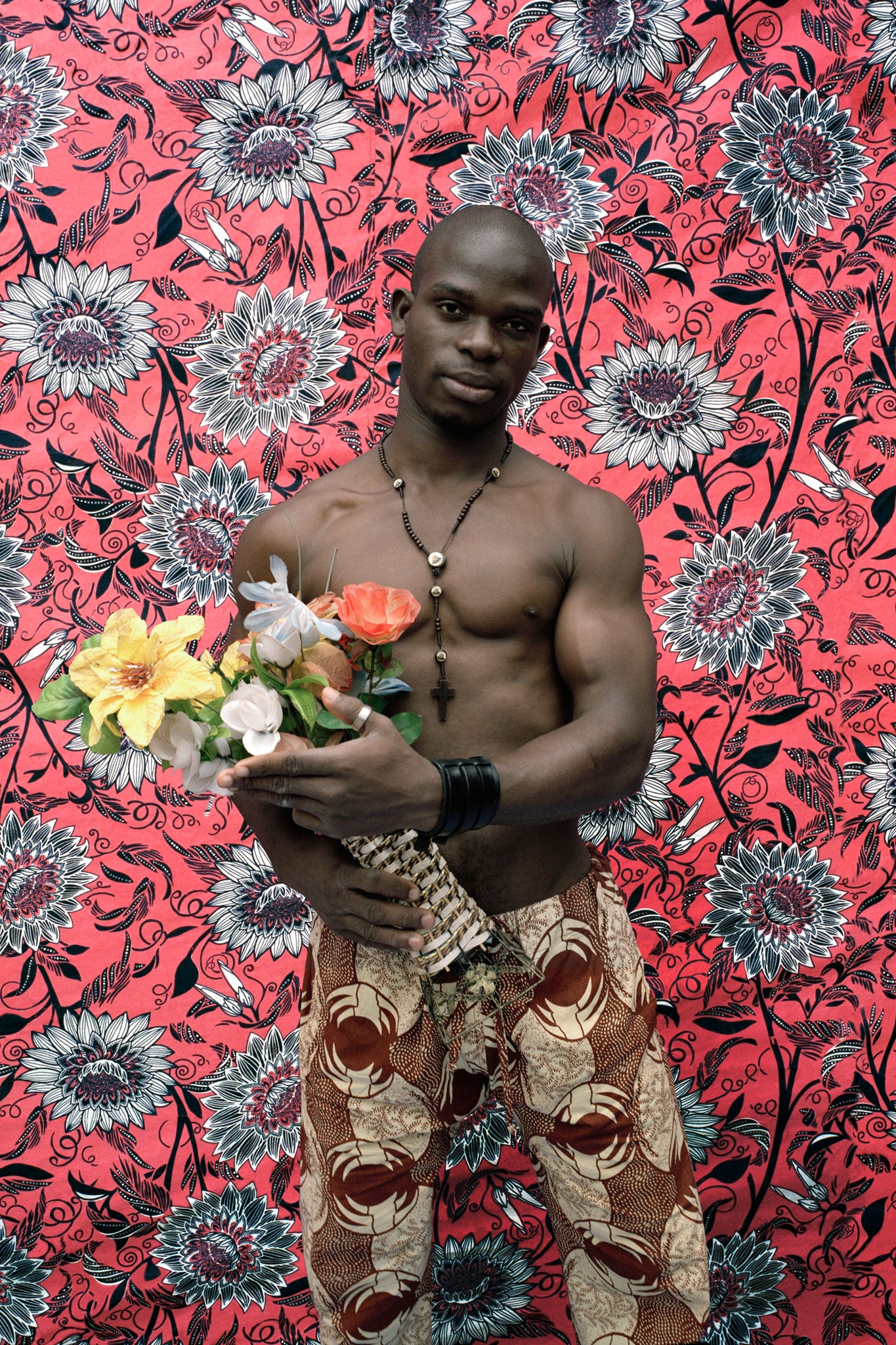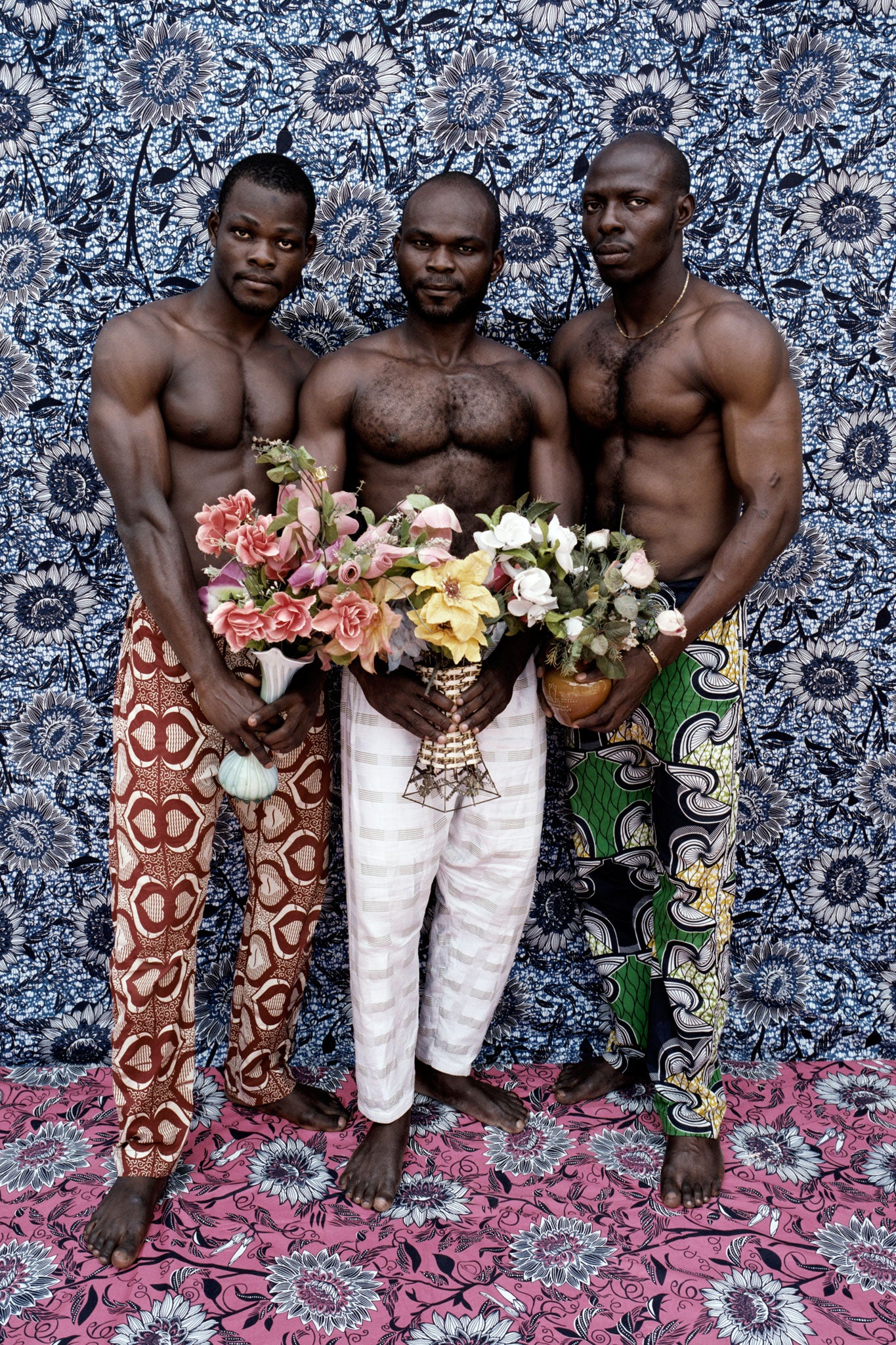 "Fashion, costume and props such as plastic flowers have always been used in the traditional studios to show style and taste." Which is why he coaxed his bodybuilders to hold them: "I like the contrast against the strong, masculine subject."