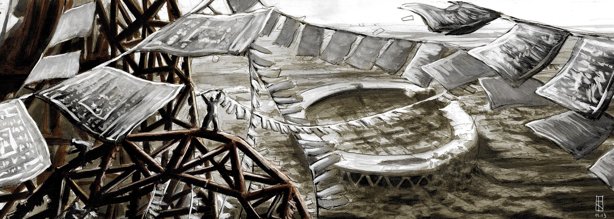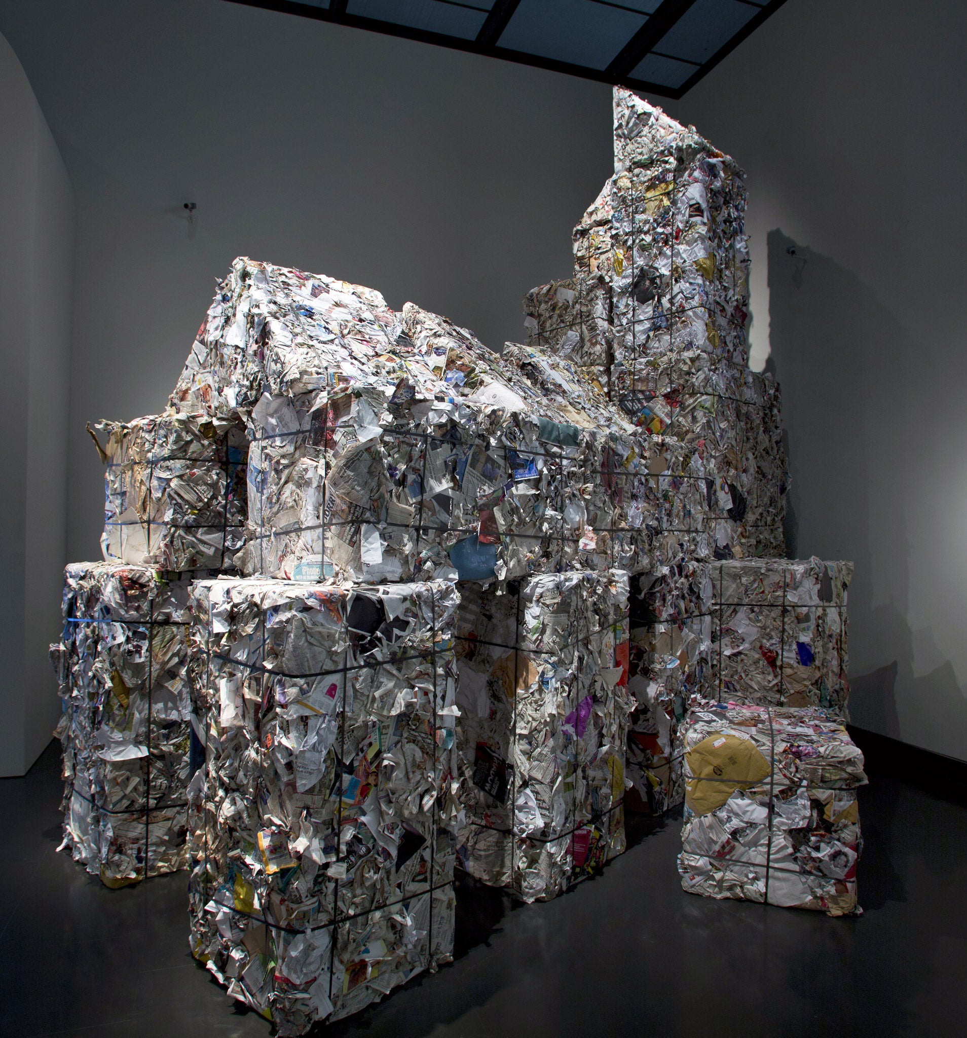 Elsewhere, Erik Kessels has made a palace out of recycled print advertising. As the co-founder of Dutch communications agency KesselsKramer, this seems like a perverse though intriguing step. The raw material of his own livelihood has been trashed and packed into blocks, and then turned into walls that the viewer can walk inside. Before the disaster, Kunzru wittily writes, “Men and women would chant: ‘I am not a plastic bag.’”