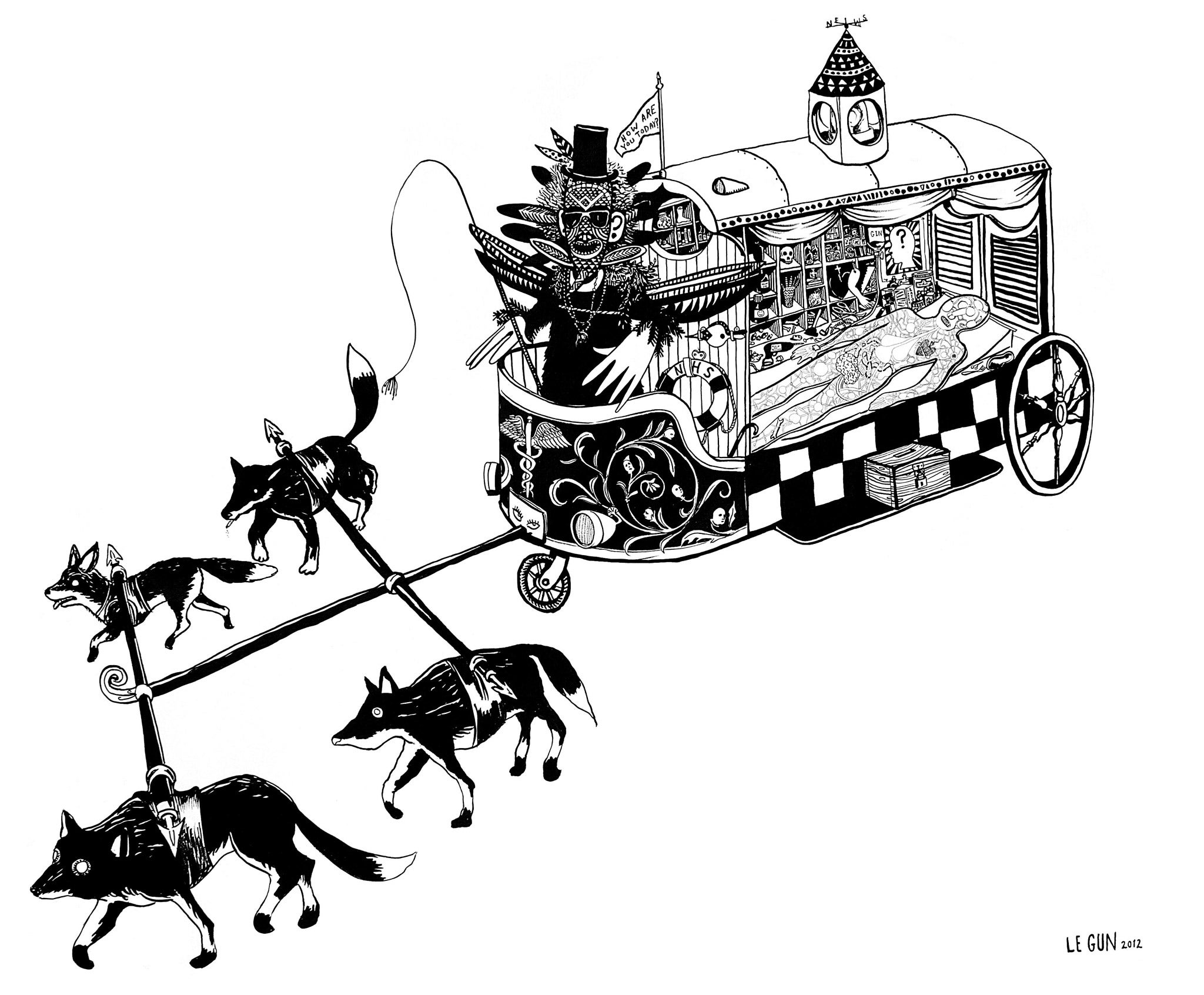This fragment of text is accompanied by a fabulous sculpture of a “misremembered” ambulance by London-based illustration collective Le Gun. A ghoulish figure brandishes a whip and pulls a cart filled with potions that promise ad-hoc, alchemical healing. One sign reads: “Are you suffering from spiritual growth?” The work points to the morbidly funny aesthetics of the Mexican Day of the Dead, but it is also a warning about what could happen if our free health care isn’t protected.