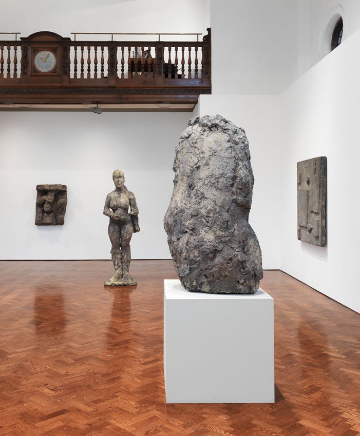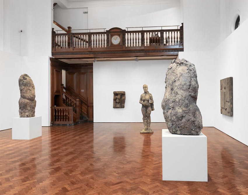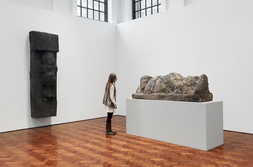 Most of the figures’ features have been erased or never existed in the first place, and their surfaces are rough and complex. Some are dusted with bronze or gold or pale blue. Ranging from one to three metres high, and partly abstract, they take up the space in a way that makes them impossible not to look at. There is something devastating about their apparent determination to either escape from their own material, or stay buried within it.