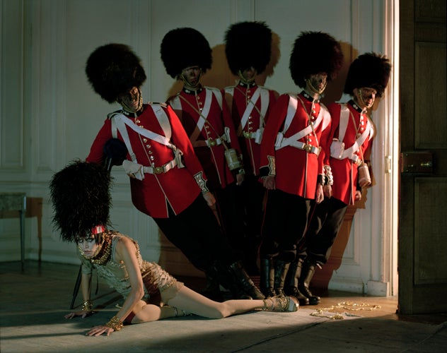 Not that all of Walker’s images are elaborate. Quintessentially British celebrities appear: Tilda Swinton wears flying goggles against a cool white background; Alexander McQueen’s only props are two cigarettes, one in his mouth and the other in the mouth of a skull on which he leans; Helena Bonham Carter is dressed as the Queen, sipping a can of coke. Walker’s portraits feel stark as compared to the excesses of his fashion spreads.