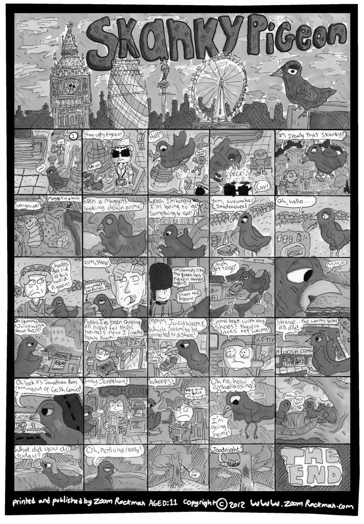 Zoom comes from creative stock – his parents, Kate and Mark, are furniture designers – and, not long after he began his Beano collection, he was inspired to emulate the historic title with a strip of his own. His first character was Crasher, a naughty boy with a penchant for vandalism. "He's based on Dennis the Menace," Zoom explains. "I made him really stupid, and I wanted him to get worse with every issue: naughtier and naughtier. So in The Zoom! issue five he goes looting in the London riots, and ends up stealing some nappies." Zoom is proud of having included such topical subject-matter. "It seems more professional," he says.