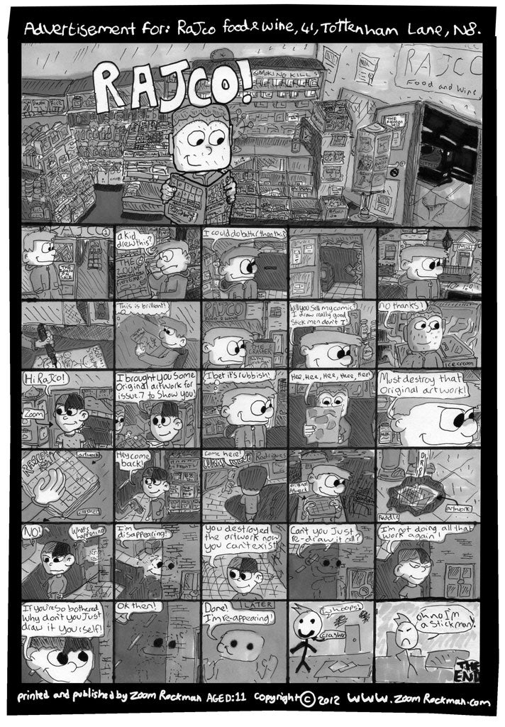 The Zoom! is stocked at Rajco, the newsagent below Zoom's flat in north London; at the Big Green Bookshop in Wood Green, where he hosted the first issue's launch party; at the Artwords bookshop in Shoreditch; at the Cartoon Museum in Bloomsbury, and at Gosh! Comics in Soho, one of the capital's top comic shops, and where I meet Zoom one evening. He is quietly spoken, nattily dressed. Which is worse, I ask, as the photographer makes him pose with a copy of issue six: being interviewed, or having your photo taken? "Probably having my photo taken," he replies. "My nan always takes loads of photos of me. So does my mum."