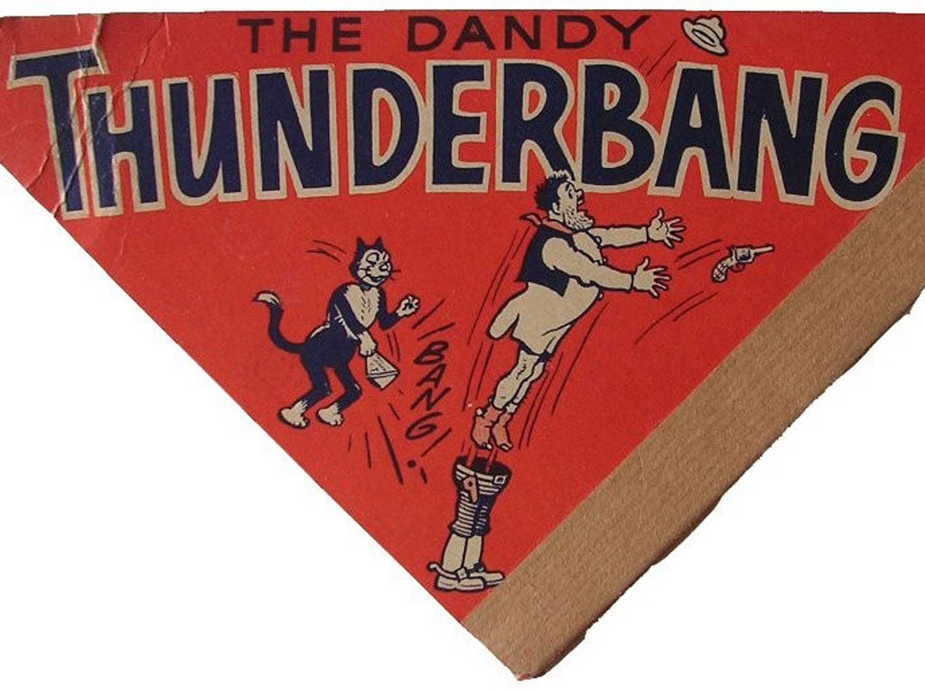 The Dandy's first ever free gift. The yellow and blue tin-plate toy had eight different engine whistles to blow. Only one is said to be left in existence, with a copy of the comic plus toy selling for £21,000 in 2004.
