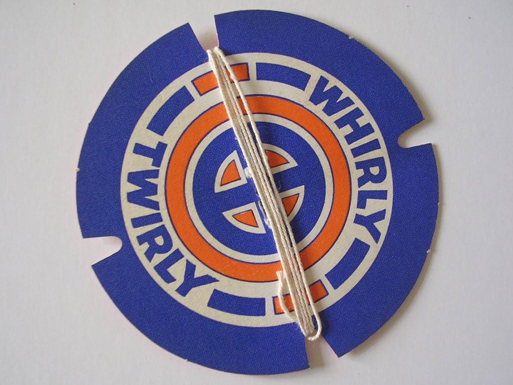 A three-inch cardboard disk with slits around the edges was attached to a piece of string and, when spun around, would create a whining sound.