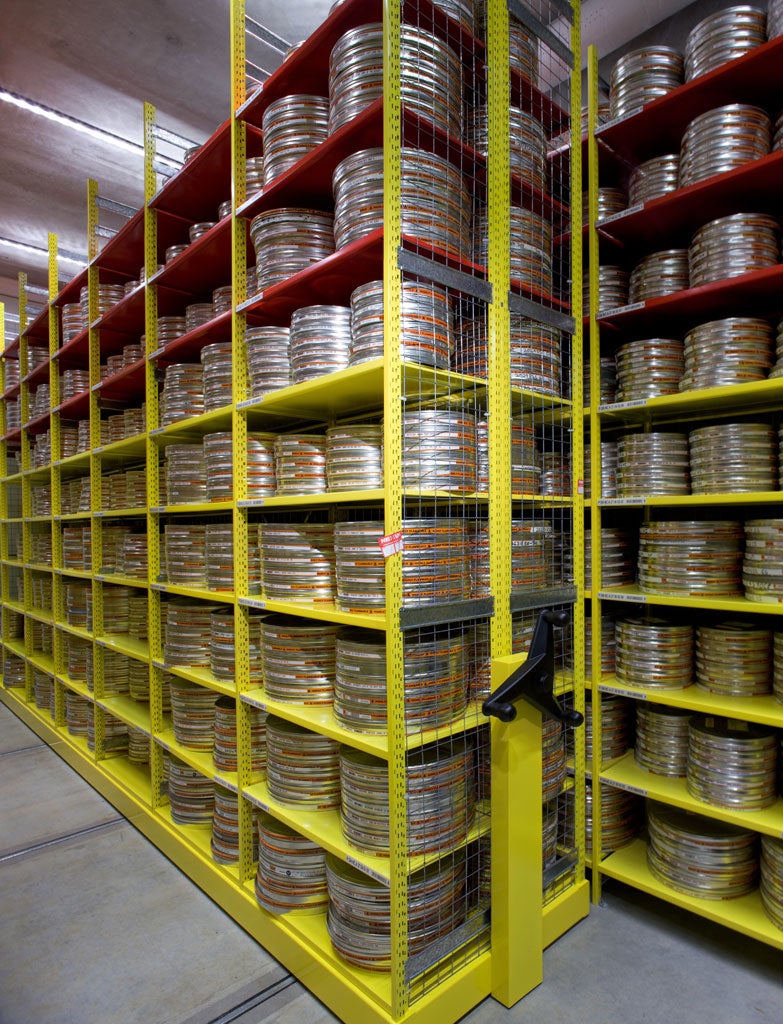 Working in an air-locked freezer is no joke: you're not supposed to stay in there longer than 40 minutes before coming out to warm up. Inside, the building is divided by two long corridors, with discrete concrete chambers on both sides. Each room is filled with floor-to-ceiling mobile stacks of metal canisters, each of which is labelled and barcoded. The barcodes speed up the sorting system, but I'm glad they still have the titles, too: so there's Kind Hearts and Coronets, elsewhere is Powell and Pressburger's The Red Shoes, but it's not just feature films: they've got the original negatives recording Captain Scott's disastrous expedition to the South Pole, and footage of the 1895 Derby. There's something strangely moving about standing here, surrounded by images of the past. It's so grim, sterile and cold, and the fridge mechanism makes a terrible whirring noise, but it's as close as you can get to touching the past.