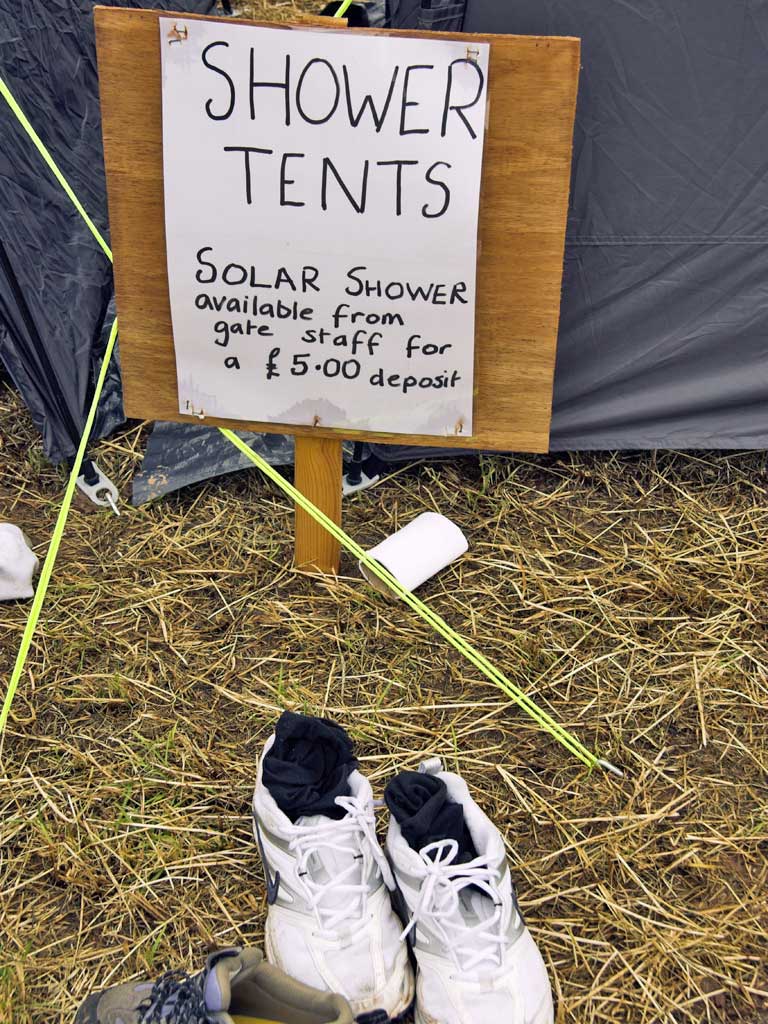 Humming is a great leveller, and the process of cleaning yourself to a vaguely civilized level is a headache – lengthy queues for water and people tutting as you huddle under the tap for your second round of shampooing. It's liberating, therefore, to make the early decision to abandon all sense of decency and embrace the rot. It's only for a few days, after all – and the bath you have when you get home will be the most satisfying of the year. If you boringly insist on some level of hygiene, however, the basic baby wipe and anti-bacterial hand gel are life savers.