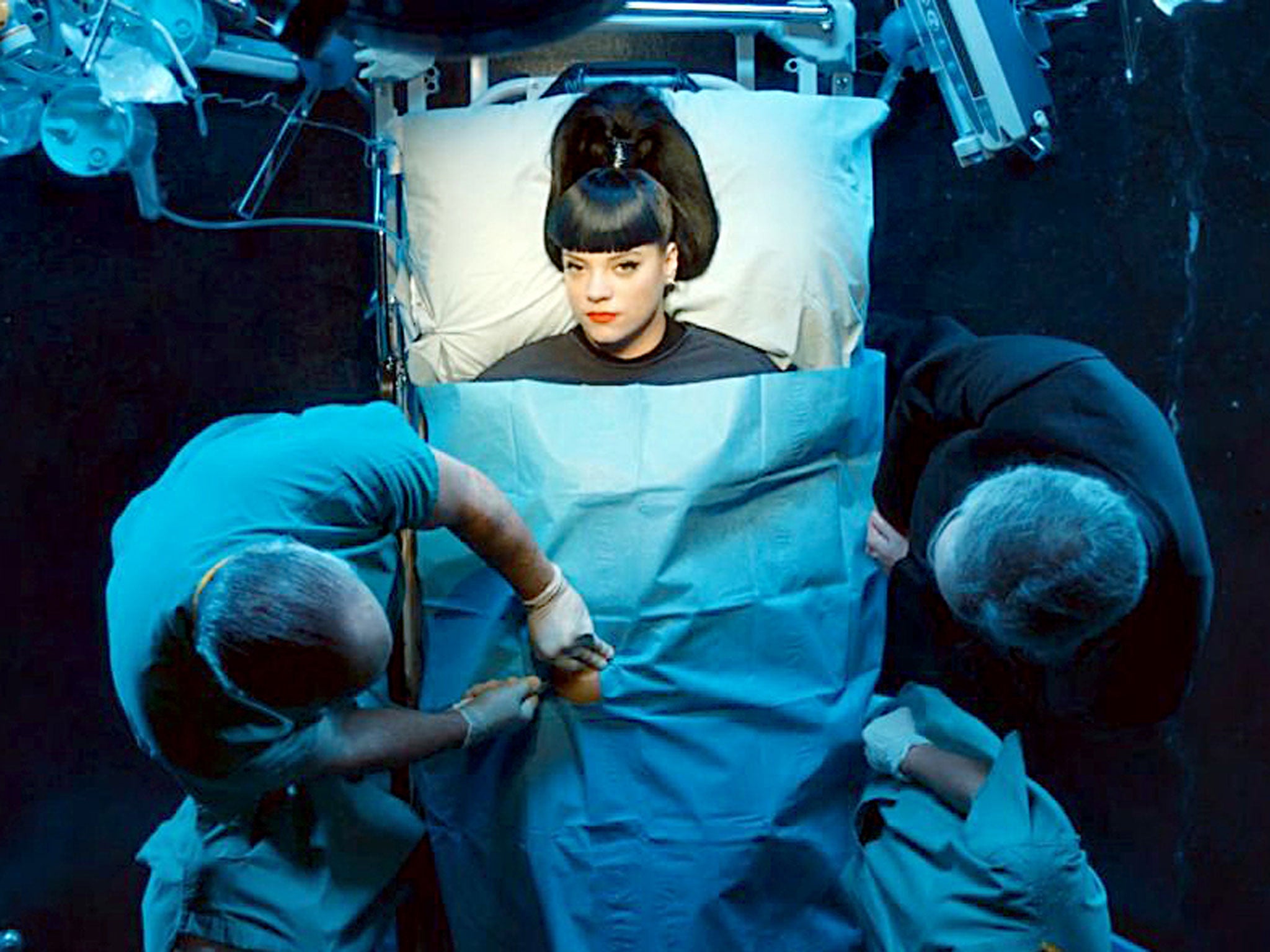 "Um… I had two babies," the 28-year-old says at the start of the video to "Hard Out Here", while a suited male executive – her manager, perhaps, or a record company minder – looms over her, instructing the surgeon to "take some more out".