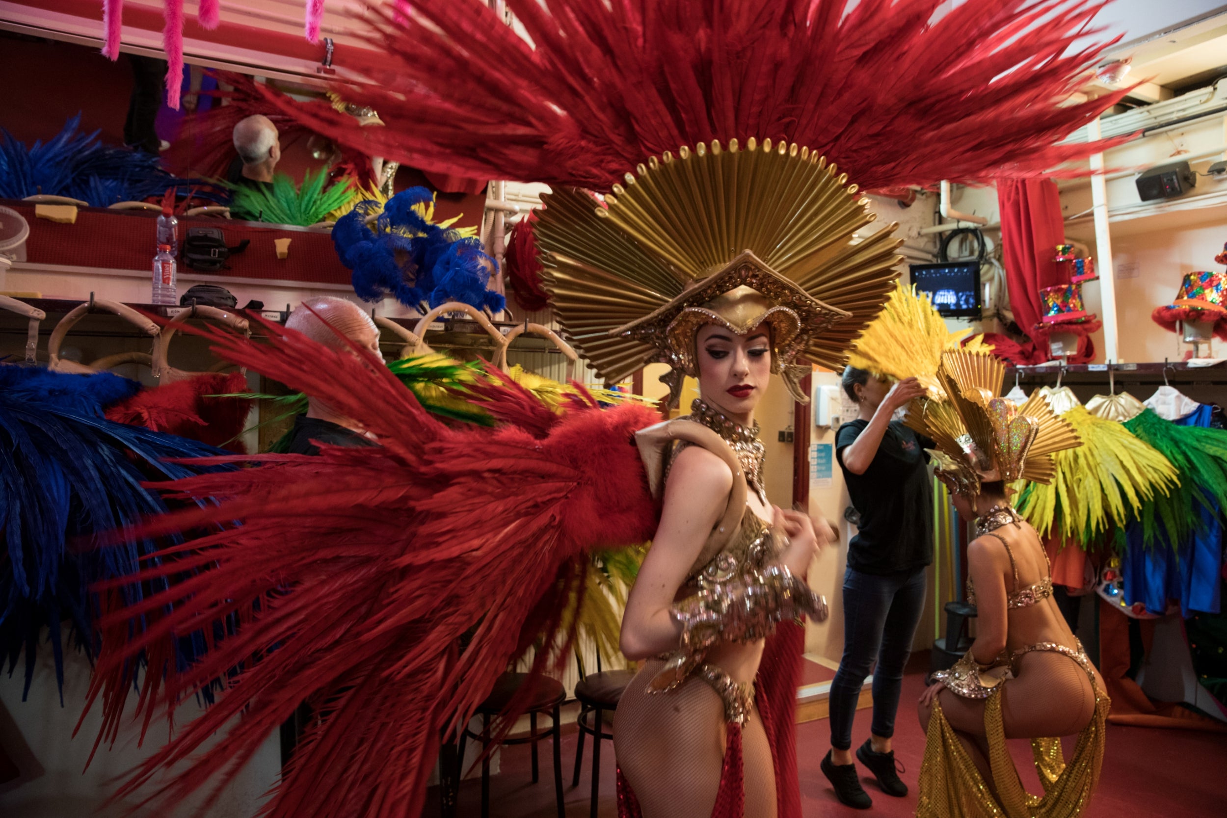 Every time a number finishes, the same scenario is repeated. The troupe of dancers rushes backstage. There, the multicoloured costumes, many encrusted in rhinestones, have been laid out in order by an army of assistants. Rows of pink feather boas hang from rails.