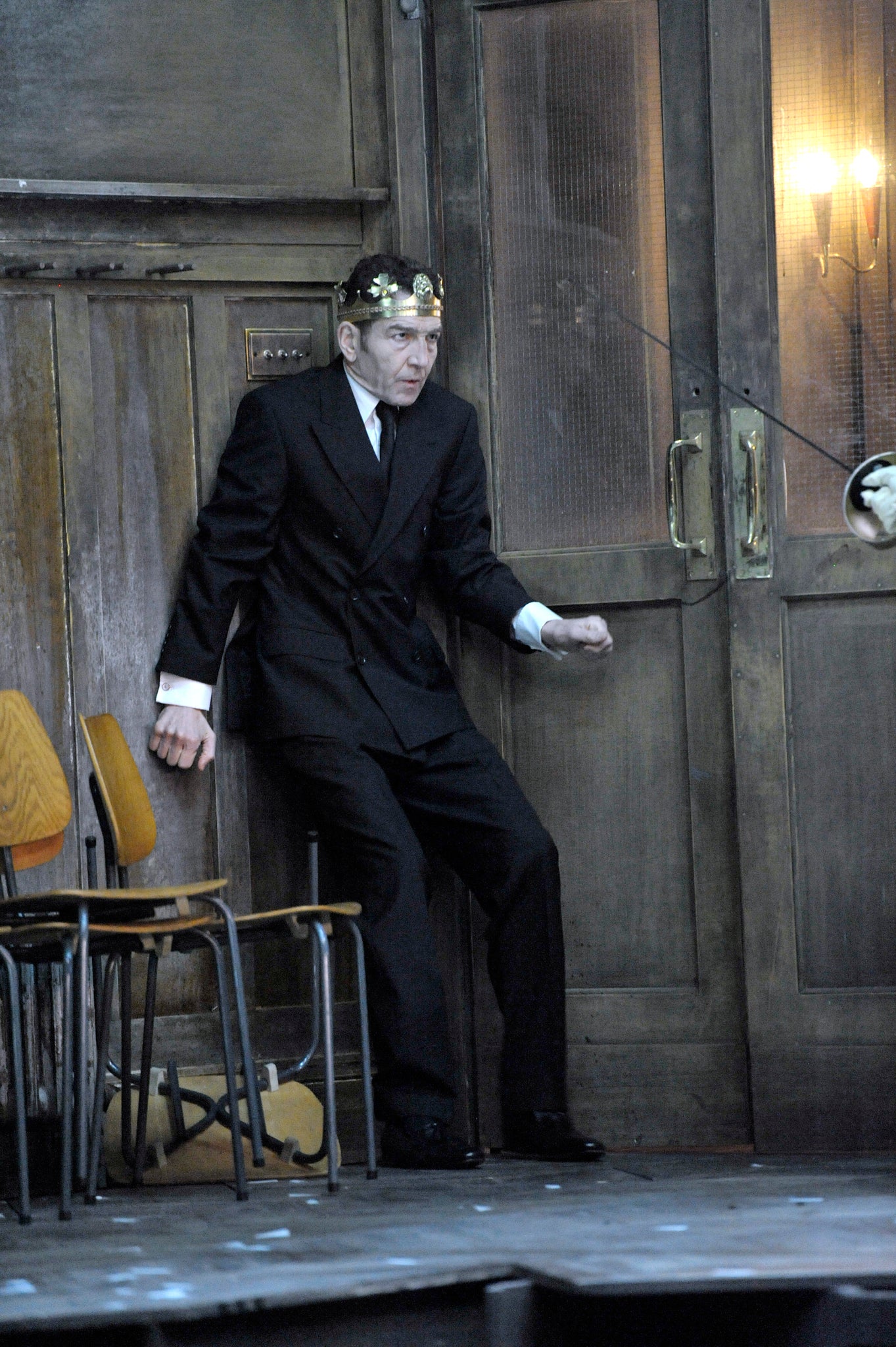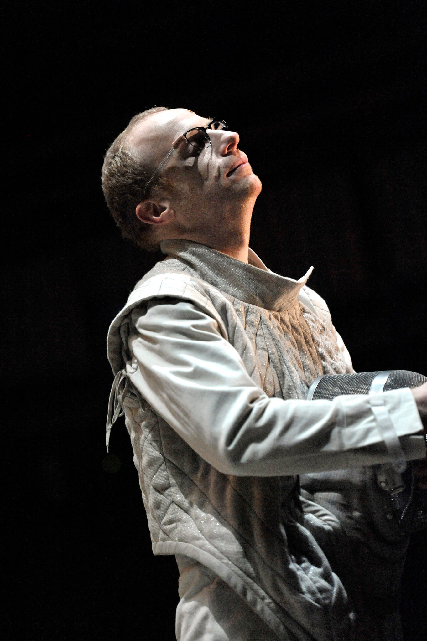 Of course, on the level of symbolism, it's a different matter. There's a sort of “In my beginning is my end” feel here, the tragedy sucked inexorably to what, in scenic terms, is registered from the outset as a foregone conclusion. No one could accuse Jonathan Slinger, Farr's Hamlet, of being cursed with blandly romantic leading-man looks (it would be like berating Donald Duck for being soporifically swanlike) and in his suit and glasses at the start he's more nerdy middle-management that princely permanent-undergraduate. But then, the setting allows him to reel around in a disarrayed fencing outfit that resembles a dangling, half-done-up straitjacket, like a calculated provocation to those who would prefer to think him mad.