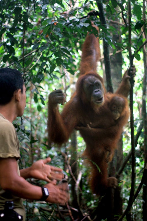 Environmentalists say orang-utans are under increasing pressure as their habitats and food sources shrink. The apes stray into fields on the edge of forests to raid fruit trees and are shot at by farmers, who capture their babies and sell them as pets. There are also claims orang-utans discovered in forests being cleared for palm oil are systematically slaughtered.