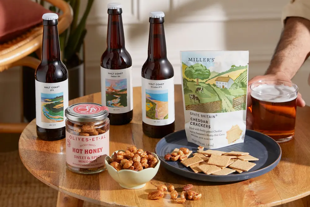 Enjoy together on Valentine's Day, or give them the gift of a solo night in. The box contains two Malt Coast IPAs and an amber ale, with cheddar crackers and a jar of hot honey mixed nuts.