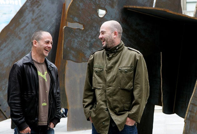 Whose idea was the split, the separation? "Mine," said Jake immediately. Really? "No," he said. "Course it wasn't." There was a silence. "I suspect it'll just be more of the same really," said Jake. "I know what I've made, but I suspect what Dinos has done isn't so different from the work we made before. After 20 years, the work starts to evolve its own components and decide its own momentum.
