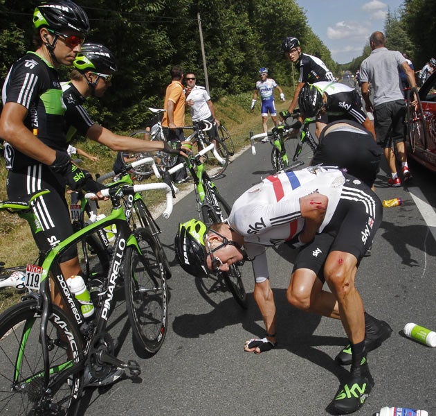 The peloton was riding fast, but not flat out in the final hour of yesterday's stage, when the final third of the bunch suddenly crumpled into a mass of bicycles and bodies. Wiggins was not initially shown on TV images, but the way Sky riders were clustering around at the side of the road in twos and threes – waiting for their British leader to remount and hopefully for them to guide him back to the finish – was the most ominous of signs.
