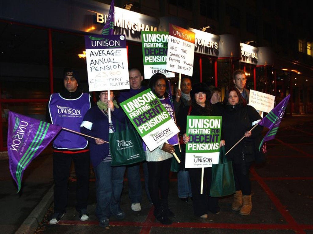 Employees at Birmingham Women's Hospital in Edgbaston were among the first public sector workers to walk out at midnight, setting up picket lines which will be manned for the next 24 hours.