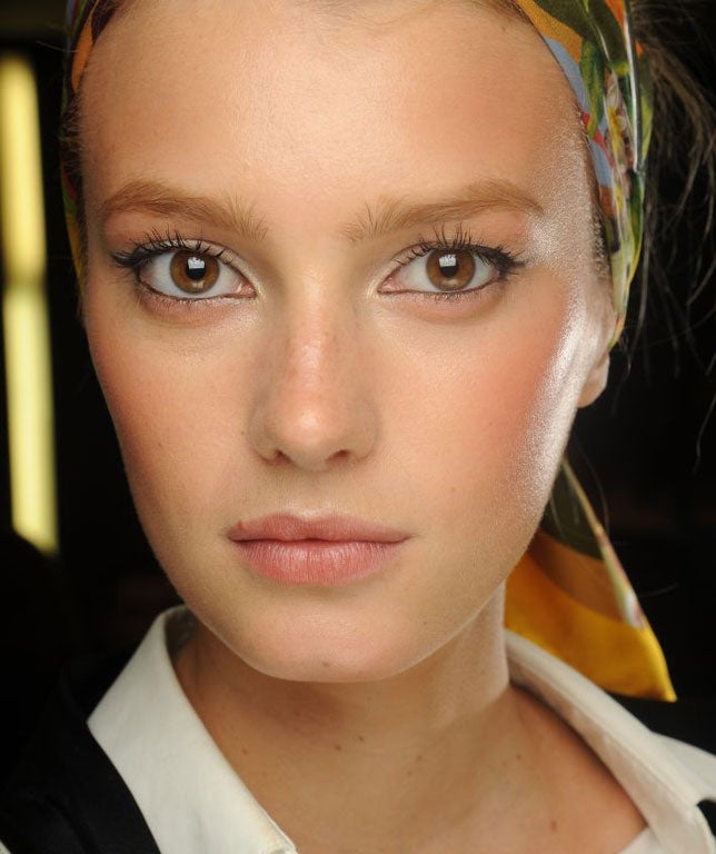 Dolce & Gabbana are regularly inspired by the glamour and opulence of their native Sicily; each of their shows is a paean to the homely – not to mention high-end – sophistication of that area. But their spring show is entitled "Fatto a Mano" or "handmade", with models wearing hessian-style bustier dresses featuring flour sack motifs, and rustic-looking wicker hoop skirts inspired by the artisan crafts of the region. Consequently, there is an undone elegance to the make-up: not too heavy or exaggerated, despite the fact that models will be walking under huge banks of lights and snapped by hundreds of lenses at the end of the catwalk.