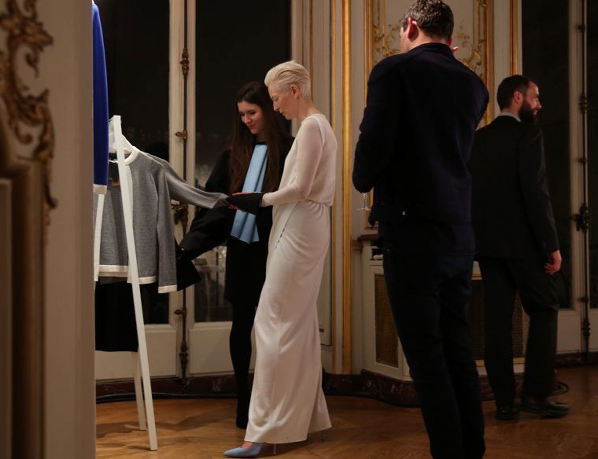 Special mention, of course, goes to Pringle's brand ambassador and honorary student, actress Tilda Swinton, who also became involved. Her contribution, a long-sleeved maxi dress in super-light cashmere silk, was based on a bathing robe Kelly wore in High Society. “It has an absolutely Grecian quality,” she revealed. “But it is very playful and it's got this transitional feel to it. It's kind of a twinset dress, a dressing gown for a part-time goddess heading for some heady drunken dancing later in the film.”