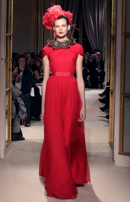 A more overt sweetness was on display at Elie Saab where the couturier took the fondant colours, prom-queen silhouette and appliquéd floral embroideries that ready-to-wear fashion is in love with and executed them with an attention to detail that will please his burgeoning client base, all loyally in attendance, no end. The minimal elegance of Giambattista Valli's petal-strewn cocoon capes and draped, pintucked raspberry silk goddess gowns was equally pleasing and only lifted by oversized silk hydrangaeas in models' hair.