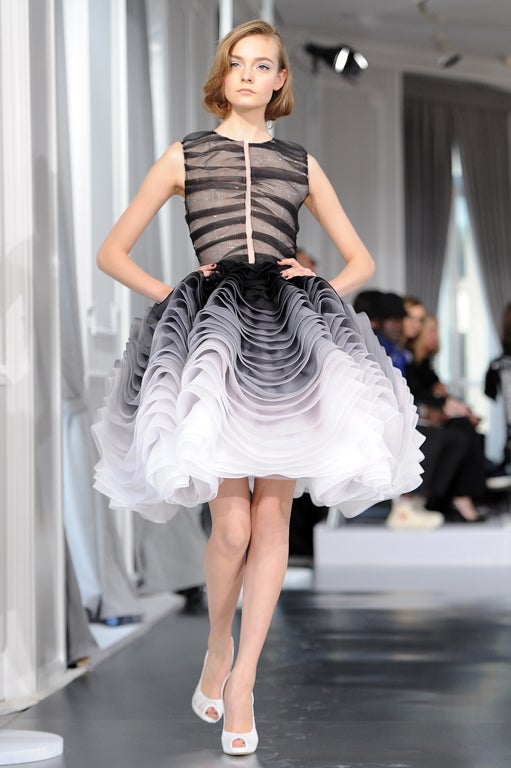 Bill Gaytten's second haute-couture collection for Christian Dior was positively frosty by comparison. The untouchable hauteur of the 1950s mannequin appeared to be the inspiration and, of course, the work of Christian Dior himself or at least an "X-ray" of it, as the show notes stated. It was more like a spectre, though, as the New Look line, the love affair with black and white, the houndstooth check, the huge, ruffled skirts were all lovingly recreated to the point of pastiche... True, there was a lightness of touch and it was acknowledged that this was a more coherent collection than Gaytten's first haute-couture offering six months ago but it was also a lifeless one. The fashion industry has long bowed to the angel of history but rarely in so literal a manner.