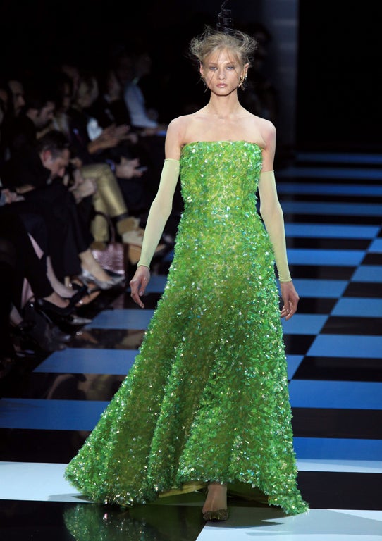 It was a controversial decision on the part of veteran Italian designer Giorgio Armani to craft pretty much his complete Armani Prive collection in the colour green. This is not an easy shade for any woman to wear. Maison Martin Margiela's Artisanal collection was a sight for sore eyes, however, featured clothing constructed out of found objects including macramé bags,rope and cord, cushion covers, Brazilian bracelets and the caps and wires from vintage champagne bottles, an apposite statement given the couture tradition's gilded status.