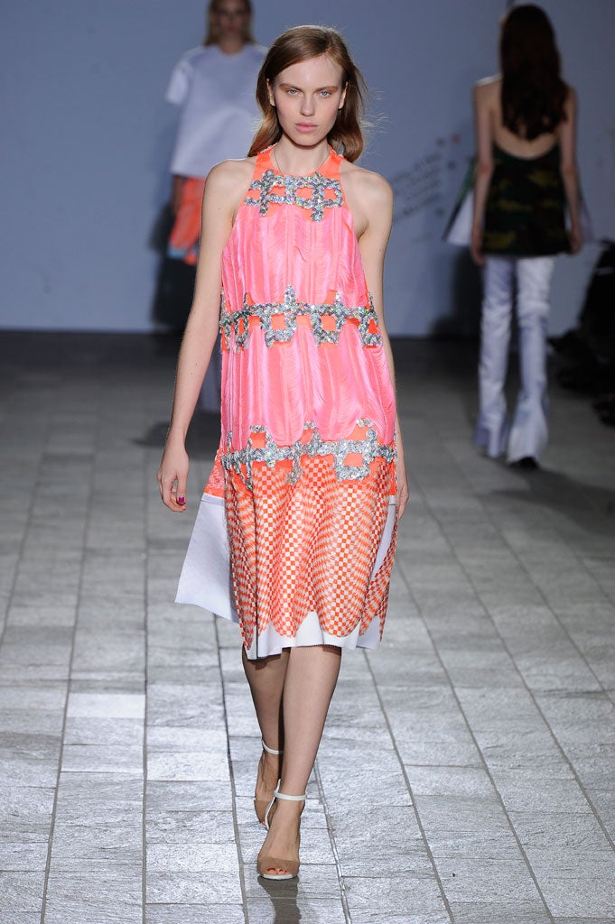 Jessica Mort's clothes are clinical in their austere cuts, but feminine and modern in their embellishments, which range from Op Art-esque prints to latticed and interlocking curlicues of sequins, beads and hardware. The frayed polyester takes on an aspect of flapper-ish fringing for a sci-fi era, and camo-print versions add dimension to flat-cut jackets and tops with long, flaring sleeves.