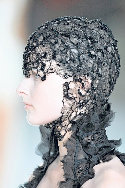 Take Rei Kawakubo's spring/summer offering for Comme des Garçons, where frothy rounds of creamy fabric bordered plain, childlike faces. Or Sarah Burton's collection for Alexander McQueen, where fabric crept up from the body, encased the skull and reached down on to the face. The finely woven lace in balmy pastel hues crafted a graceful softness from the macabre silhouette. Burton sought the femininity in a futuristic aesthetic for autumn, with mirrored visors adorning plain ladylike faces.