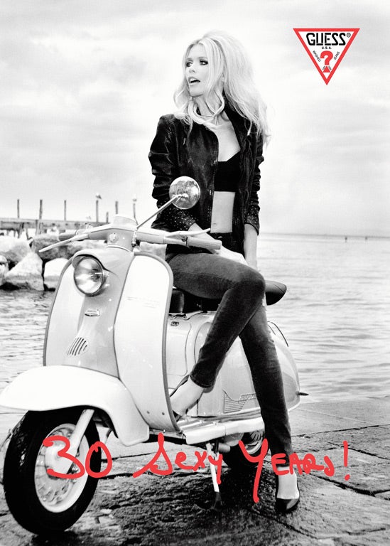 To celebrate that continued dream, a capsule collection of 15 pieces is being released – which sees the flower-print jeans that Drew Barrymore and Eva Herzigova modelled in the early Nineties, Herzigova's black and white sleeveless shirt and Schiffer's cropped corset from the late Eighties reissued for the present day. Key campaigns from years gone by adorn lightweight jersey T-shirts while a limited edition T-shirt is embellished with Guess's triangular logo and that celebratory phrase "30 Sexy Years".