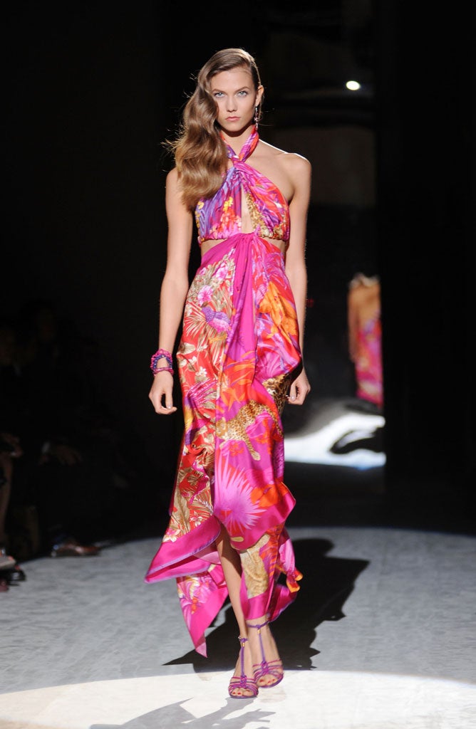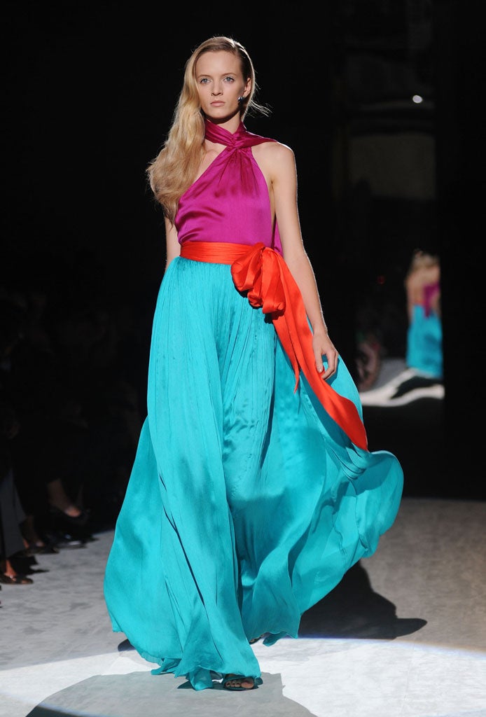 Giornetti's fervour for the animation that only the wearer can bring to fashion perhaps masks the importance he places on the narrative behind the presentation of a collection. I visited Milan in mid-January to view the pre-fall collection, which for the first time was being presented to the press. A fortnight before I was due to travel, I received an email from Ferragamo's UK publicist explaining that there was a "serious problem" with the chosen location and the trip could be cancelled unless another venue which matched the mood of the collection could be found. It went ahead as planned, however: a cinematic presentation in an ornately decorated waiting-room in Milan's central train station. The location was central to the narrative of the collection, which presented the "fragments of a journey" of an "ultra-sophisticated woman". Made up of rich jewel shades juxtaposed with soft nude tones, the feminine pieces were discreetly opulent – exotic skins trimmed and patched knitwear and pleated skirts.