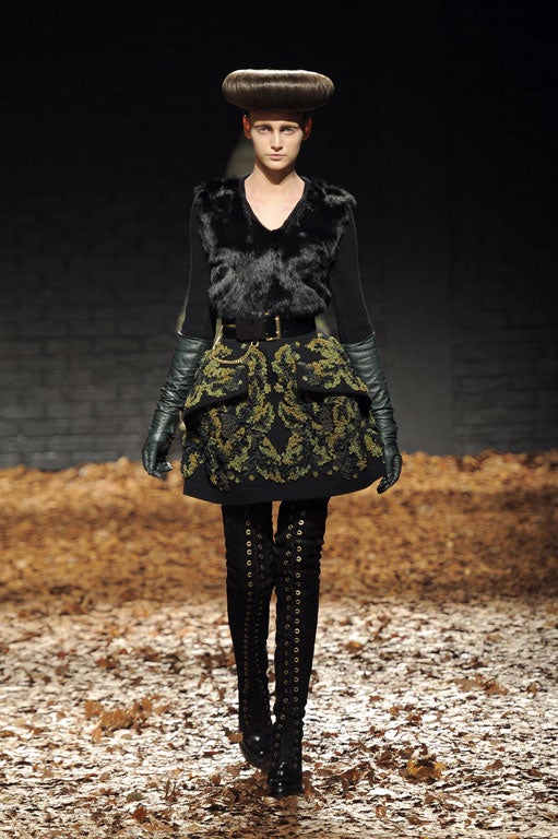 Sarah Burton's catwalk debut for McQ was, similarly, crafted in humble fabrics and boasted a strong-shouldered, waisted silhouette – this time achieved with wide, leather chain-belts. There was nothing much delicate about any signature embroideries: they were quite as robust as the clothes. McQueen being McQueen the finale was a big one: "a never-ending forest" was home to a disco/absinthe shack presided over by the fiercest supermodel of them all, Kristen McMenamy, and conceived by theatre company Punchdrunk.