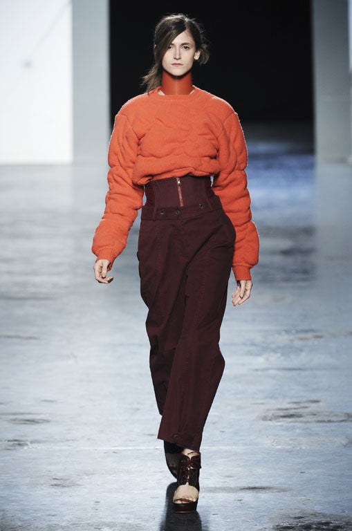 If ever proof were needed that heavy, almost industrial fabrics, have ousted gentle chiffon and lace it came in the form of Acne's show. Oversized dungarees suspended from huge, elasticised straps and worn over Puffa jackets, quilted sweaters tucked into wide-legged, high-waisted trousers, a violent lime fleece worn over more inflexible vinyl, scratchy wool corsets fitted over bulky sweaters and jackets and quite the most ungainly footwear imaginable made for a collection that was as fashionable in its utilitarian viewpoint as it was witty.