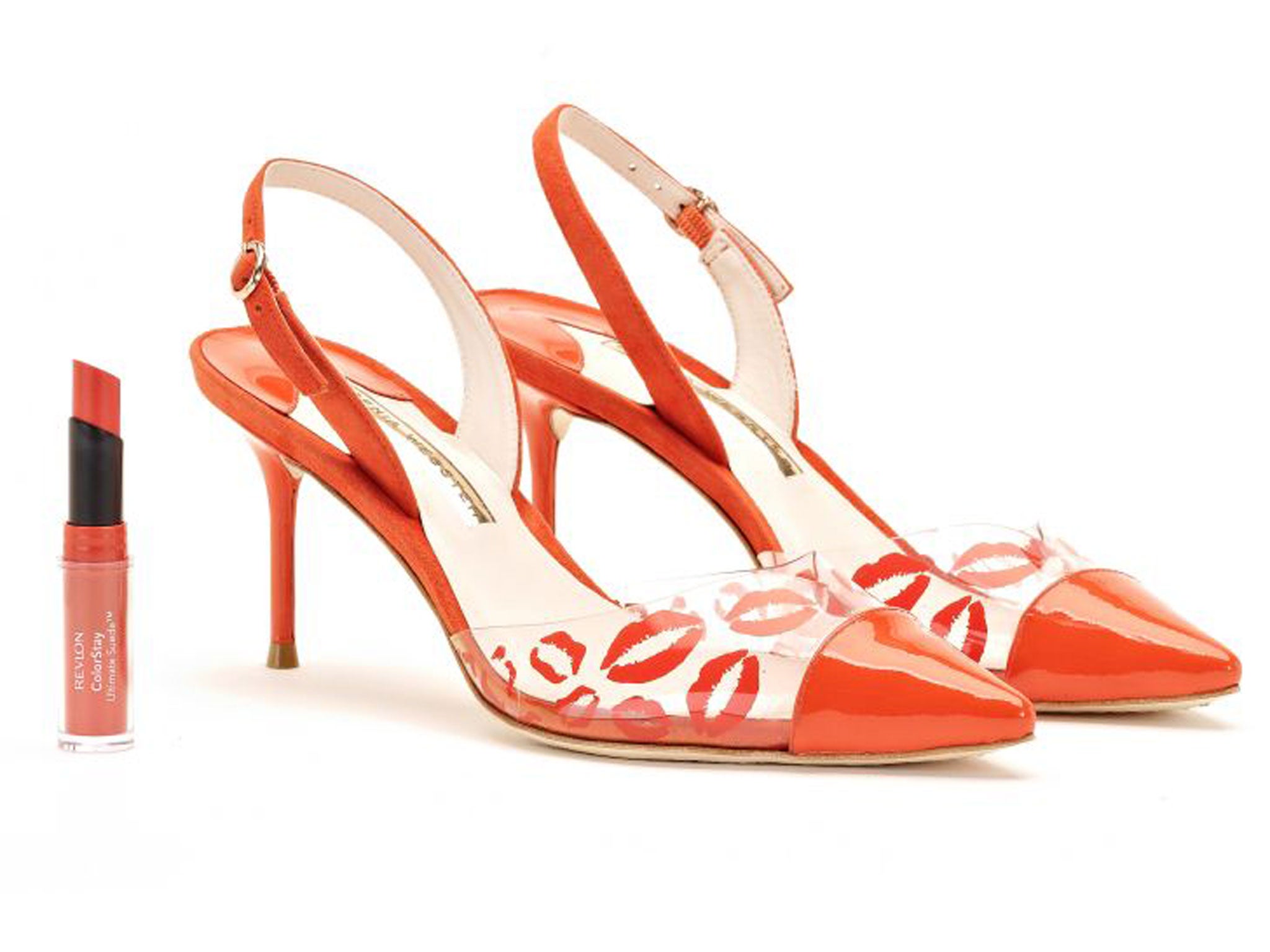 Now the fledgling talent has been commissioned to create a range of designs exclusive to Revlon to celebrate the launch of its ColorStay Ultimate Suede, a new line of 14 lipsticks. Available now, Suede by Sophia takes the chic matte finish of the lipsticks as the starting point for a collection of eight matching high-heel styles – each of which is given individual details inspired by a particular shade. Known for her use of graphic motifs, here a kiss is replicated as contrasting embroidery on suede and colour stamped on to clear vinyl, while the straps on one style are even modelled on a traditional lipstick bullet. The suede connection is taken further still, with the fabric appearing on each design.