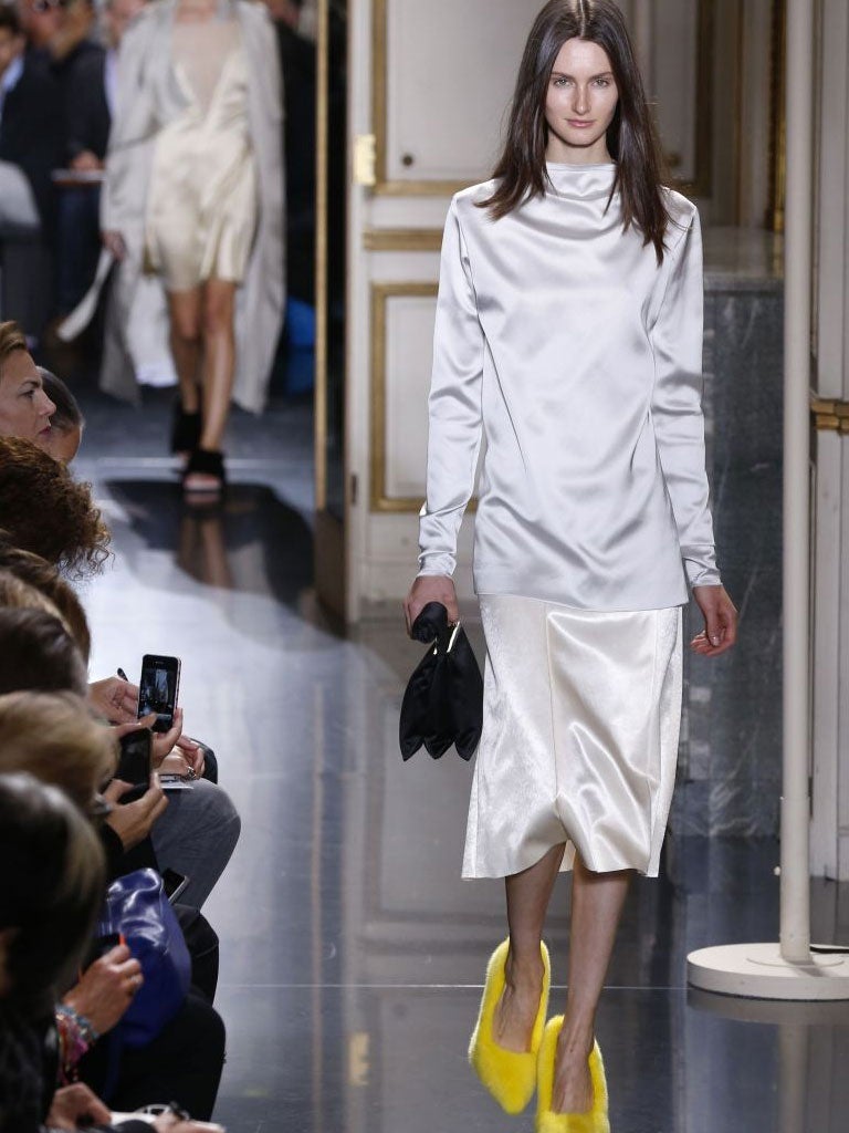 With that in mind, the Céline "classic" and "cabas" bags, the Crombie coat, the perfectly simple white shirt, pair of black trousers and silk crepe tuxedo are now firmly established as part of the brand's vocabulary and are all present and correct this time around too. They make a discreetly luxurious and essentially timeless statement ensuring that discerning women of means who would rather not flaunt their wealth on their sleeve remain in safe hands. At the same time, Philo's latest offering was a hugely confident move forward and one that told a warmer story.