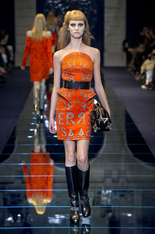 Which was also apposite for Donatella Versace's autumn offering, although this designer prioritised sex appeal over romance. The house's bravado shone through in her "rock chick" look, which was made gothic with crushed velvet, armour-style bodices and pieces decorated with Byzantine crosses, and hammered home especially in citrus-bright bustier dresses printed with lettering that spelled out the label's name. It was a prime bit of opulent muscle-flexing from a name enjoying a timely resurgence in popularity after its return to the Paris couture schedule last month and two sell-out collections for high-street chain H&M, and its strength lay in unabashed references to the label's Nineties heyday.