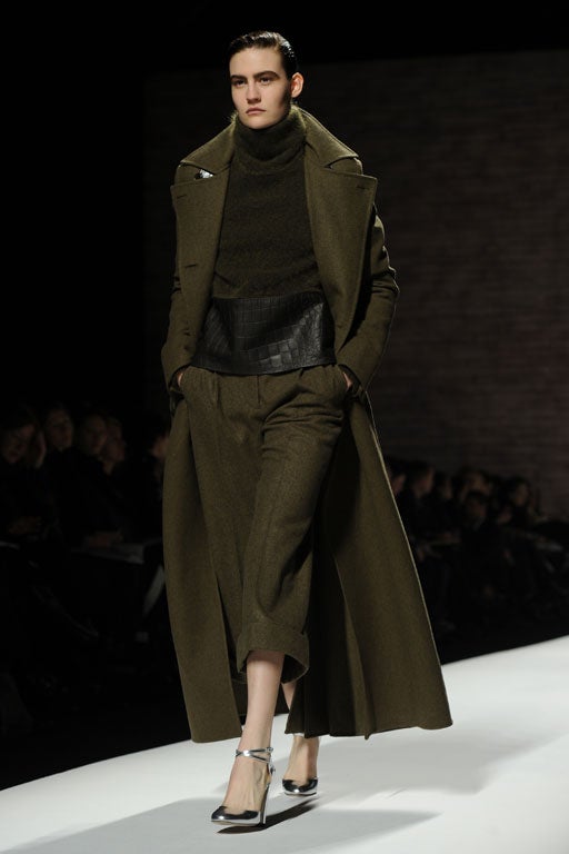 At MaxMara too, outerwear was as subtle as it was well-executed: its iconic camel coat was transformed into a utilitarian jumpsuit, and greatcoats came in olive green cashmere, felted for a more functional finish and with none of the conspicuous gold buttons that the label normally uses. Likewise, the brand's diffusion line Sportmax presented a range of panelled and body-conscious shift dresses that felt pragmatic and decidedly un-showy. These Italian labels, which rely more on their heritage and staple pieces than they do on trends, appear to be taking their pointers from Italian President Mario Monti's austerity bills.