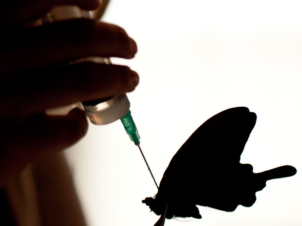 All his animals, sourced from a gamekeeper, are frozen for two weeks before anyone works on them, to ensure diseases are killed off. I am kitted out with blue dentist's gloves for further protection. I start by practising on an Indonesian butterfly, then graduate to Derek. After cutting the neat line down his stomach, I start to turn it inside out, removing his tiny rib cage and skull. Once his innards have become outtards and entrails removed, the mouse needs a bath. It is soaked in a washing-up liquid that is kind to hands that do dishes – ideal for the job.