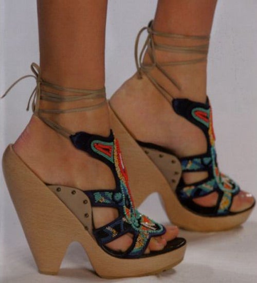 Choosing not to wear leather is no mean feat: plastic often looks cheap, and can be, well, just a tad sweaty, not to put too fine a point on it. Stella McCartney saved the day for fashion-loving vegetarians when she refused to work with leather or fur in her 2001 collection. This season, the designer has gone back to nature and produced a floral and African-themed collection. Central to this are these hand-carved glass-beaded sandals. Practice before stepping out in them on safari is advised, though. Even the models looked nervous coming down the catwalk in these vertiginous platforms.