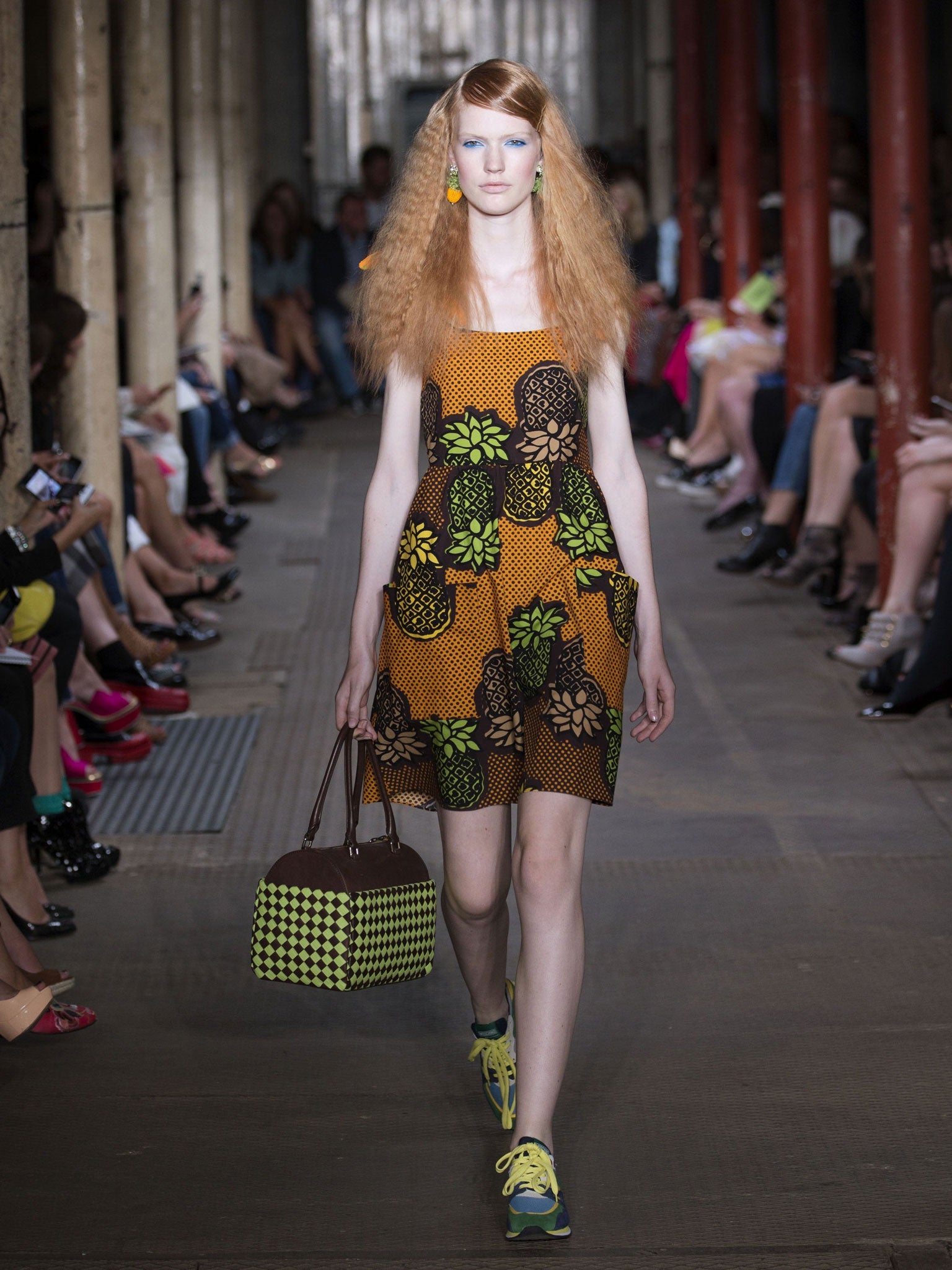 For Moschino Cheap and Chic, Rossella Jardini sent the spiky fruit down the catwalk emblazoned in glorious technicolour across everything from pant suits to bikinis and even bags – which are flying off the shelves. “I was inspired to use pineapples in the collection as they fit in perfectly with the tropical colour palette,” says Jardini, creative director of the house. “They added a playful element and worked as a print as well as a pineapple-shaped bag. Smaller pineapples could be seen on clasps of the handbags as well as earrings worn by the models.”
